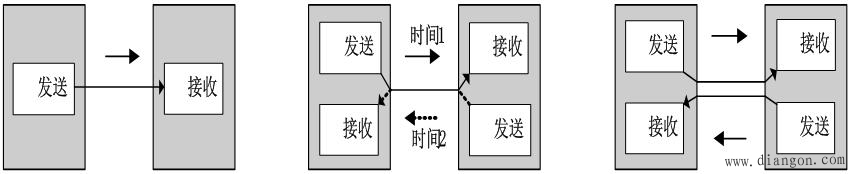 串行通讯中包含三种制式:单工方式、半双工方式、全双工方式。这三种制式可以通过图5来观察。其中着重注意全双工方式,即双向数据通讯方式。
