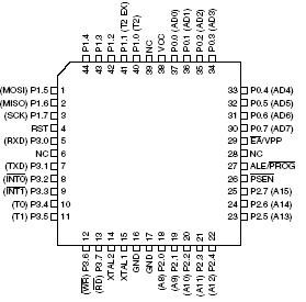 常见的AT89S52单片机有PDIP封装(如图1所示)、plcC封装(如图2所示)、TQFP封装(如图3所示): 图1 PDIP封装的AT89S52实物图  图2 PLCC封装的AT89S52实物图 图3 TQFP封装的AT89S52实物图 PDIP封装的AT89S52外部引脚如图4所示。PLCC封装的AT89S52外部引脚如图5所示。TQFP封装的AT89S52外部引脚如图6所示。