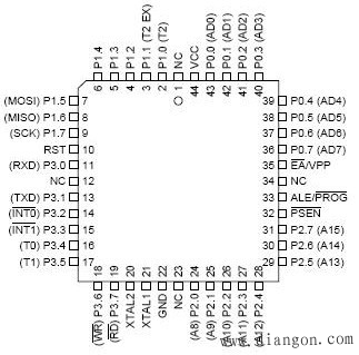 图4 PDIP封装的AT89S52外部引脚图 图5 PLCC封装的AT89S52外部引 图6 TQFP封装的AT89S52引脚图 1.主电源及时钟引脚