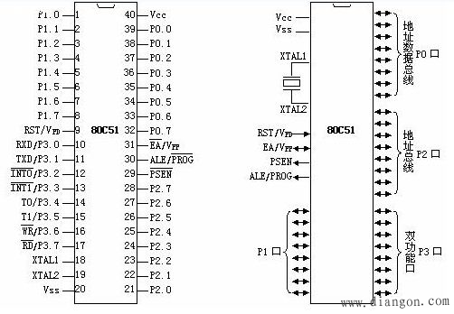 80C51单片机属于MCS-51系列单片机,采用40引脚双列直插式DIP(Dual In Line Package),内有128个RAM单元及4K的ROM。