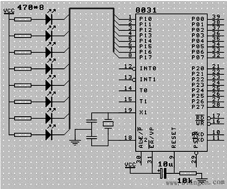 我们的第一个任务是要用单片机点亮一只发光二极管LED,显然,这个LED必须要和单片机的某个管脚相连,不然单片机就没法控制它了,那么和哪个管脚相连呢?单片机上除了刚才用掉的5个管脚,还有35个,我们将这个LED和1脚相连。(见图1,其中R1是限流电阻)