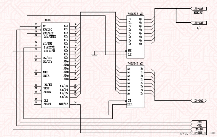 8088的数据总线为D0~D7,为增强数据总线的负载能力,可采用74LS245作为数据总线的驱动电路。使能控制端-G为数据使能控制信号DEN,当此信号=0,使74LS245处于有效状态,方向控制端DIR端为微处理器的方向控制信号DT/-R,当此信号=0时,信号从B流向A,保证了系统在读操作时数据从存储器或I/O接口送往微处理器。
