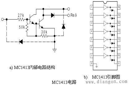 2.晶体管阵列 当需要多路晶体管驱动输出时,可选用集成晶体管阵列(MC1413),以简化电路,降低成本。 MC1413 中每一路达林顿晶体管可提供 500mA 驱动电流,集电极电压可达 50V 。每一路晶体管均带有续流二极管,用于带感性负载时保护晶体管。