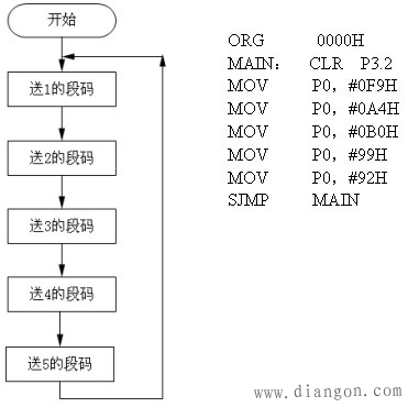 设计中要求循环显示1~5,很显然应采用循环的方法来实现,最简单的方法是将1~5的段码依次由P0口送出。