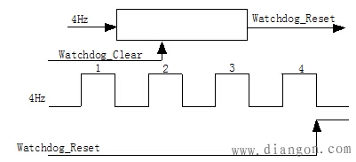 例如,凌阳单片机SPCE061A的WatchDog的清除时间周期为0.75s。因为WatchDog的溢出复位信号WatchDog_Reset是由4Hz时基信号经4分频之后产生的,即每4个4Hz时基信号(1s)将会产生一个WatchDog_Reset信号。而清除WatchDog的WatchDog_Clear信号却可以发生在4Hz信号(0.25s)之间的任意一个时刻点上。假如WatchDog_Clear信号发生在4Hz信号尾端的0.01s即第0.25s时刻,此时虽然WatchDog被清除掉,但由于它发生在4Hz信号之后,再经3个4Hz信号即0.75s,如果一直没有WatchDog_Clear信号,便会产生出一个WatchDog_Reset信号。如图2所示,如果程序运行不正常,例如陷入死循环等,计数器将记满而产生溢出此溢出信号用来产生复位信号,使程序重新开始启动。在编程中,我们只需将0X0001H写入P_WatchDog_Clear单元即可完成清除WatchDog操作,如果在0.75秒内没有将0X0001H写入P_WatchDog_Clear单元,则CPU将进行系统复位操作,即平常我们说的重启系统。看门狗经常用于延时程序中,如