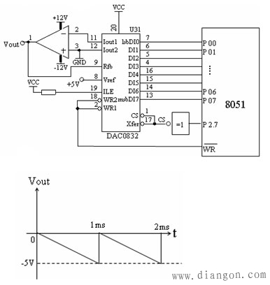 要求:编程实现从 Vout 端输出一个幅值为 5V ,频率 f=1KHZ 的反向锯齿波电压