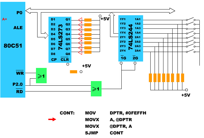 图为采用 74LS244作为扩展输入、74LS273作为扩展输出的简单I/O口扩展。