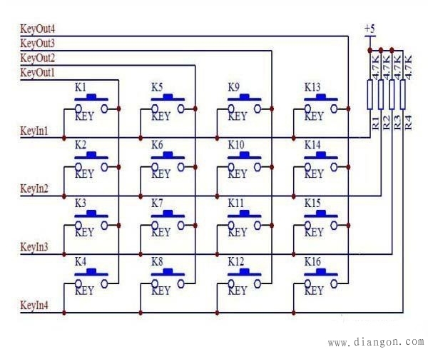 4条输入线接到单片机的IO口上,当按键K1按下时,+5V通过电阻R1然后再通过按键K1最终进入GND形成一条通路,那么这条线路的全部电压都加到了R1这个电阻上,KeyIn1这个引脚就是个低电平。当松开按键后,线路断开,就不会有电流通过,那么KeyIn1和+5V就应该是等电位,是一个高电平。我们就可以通过KeyIn1这个IO口的高低电平来判断是否有按键按下。