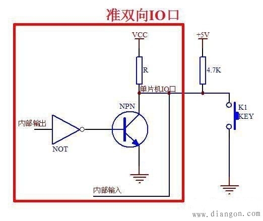 当内部输出是高电平,经过一个反向器变成低电平,NPN三极管不会导通,那么单片机IO口从内部来看,由于上拉电阻R的存在,所以是一个高电平。当外部没有按键按下将电平拉低的话,VCC也是+5V,他们之间虽然有2个电阻,但是没有压差,就不会有电流,线上所有的位置都是高电平,这个时候我们就可以正常读取到按键的状态了。