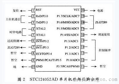 控制芯片采用STC12C4052AD,它是1个时钟/机器周期的单片机,速度比普通的8051单片机快8~12倍,有20个引脚且为小巧封装。该单片机具有超强抗干扰,抗静电的特点,能轻松通过4 kV快速脉冲干扰,其功耗超低,正常工作模式下的典型功耗为2.7~7 mA。芯片自带硬件看门狗,具有高速SPI通信端口,8通道8位A/D转换,2路PWM输出,4 KB容量的FLASH存储器,256 B容量的SRAM,4个定时器,1个全双工串行通信口。由于单片机内部的资源丰富,性价比高,能够满足该设计的要求,而且减少了硬件电路的设计,提高了工作效率。单片机的外部引脚定义,及其在该设计中的资源分布如图2所示。