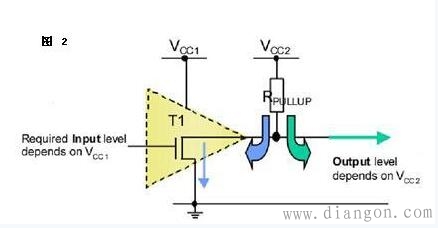 3. 可以利用改变上拉电源的电压,改变传输电平。如图2, IC的逻辑电平由电源Vcc1决定,而输出高电平则由Vcc2(上拉电阻的电源电压)决定。这样我们就可以用低电平逻辑控制输出高电平逻辑了(这样你就可以进行任意电平的转换)。(例如加上上拉电阻就可以提供TTL/CMOS电平输出等。)