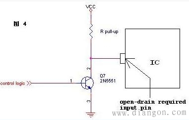 1. 开漏和开集的原理类似,在许多应用中我们利用开集电路代替开漏电路。例如,某输入Pin要求由开漏电路驱动。则我们常见的驱动方式是利用一个三极管组成开集电路来驱动它,即方便又节省成本。如图4。