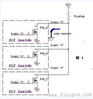 1. 利用外部电路的驱动能力,减少IC内部的驱动(或驱动比芯片电源电压高的负载)。当IC内部MOSFET导通时,驱动电流是从外部的VCC流经R pull-up ,MOSFET到GND。IC内部仅需很下的栅极驱动电流。如图1。