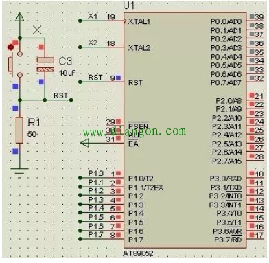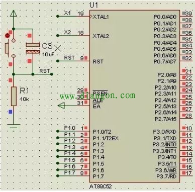 大家可以看到复位电路中电阻R1=10k时RST是高电平 ,而当R1=50时RST为低电平,很明显R1=10k时是错误的,单片机一直处在复位状态时根本无法工作。出现这样的原因是由于RST引脚内含三极管,即便在截止状态时也会有少量截止电流,当R取的非常大时,微弱的截止电流通过就产生了高电平。