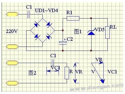 如图-1,C1 为降压电容器,D2 为半波整流二极管,D1 在市电的负半周时给C1 提供放电