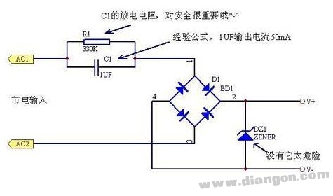 将交流市电转换为低压直流的常规方法是采用变压器降压后再整流滤波,当受体积和成本等因素的限制时,最简单实用的方法就是采用电容降压式电源.