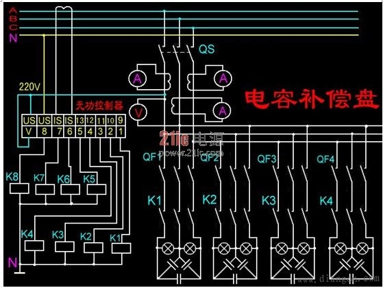 根据所测得的功率因数值(F),当F小于1时(一般是0.97),就启动继电器并联上一个补偿电容,当大于1时就启动继电器去掉一个补偿电容。