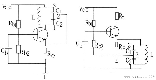 如下图所示为两个电容三点式的振荡电路图。左边图中的晶体管的发射极接的是三点式选频网络的2端,集电极接的是1端,基极在交流通路中接地,所以基极相当于接的是3端。发射极与基极问接的单个选频器件是电容C2,发射极与集电极之间接的是电容Cl,发射极与其他两个电极之间接的是电抗性质相同的电容,所以射同已经满足;基极与发射极接的电容C2,基极与集电极之间接的单个选频器件是电感L,电感与电容是两个电抗性质相反的器件,所以基反也是满足的,图2电路支流通路正常,又满足射同基反的条件,所以是可以振荡的。