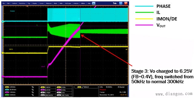 第3阶段从FB引脚检测到0.4V电压开始(图6)。该触发之后恒定电流稳定回路将完全接通,所以开关频率可自动调节至预编程的300kHz.在更高的开关频率下,电感电流纹波(绿色迹线)显着减小。输出电压(粉色迹线)继续呈线性增加,表示超级电容被线性充电。