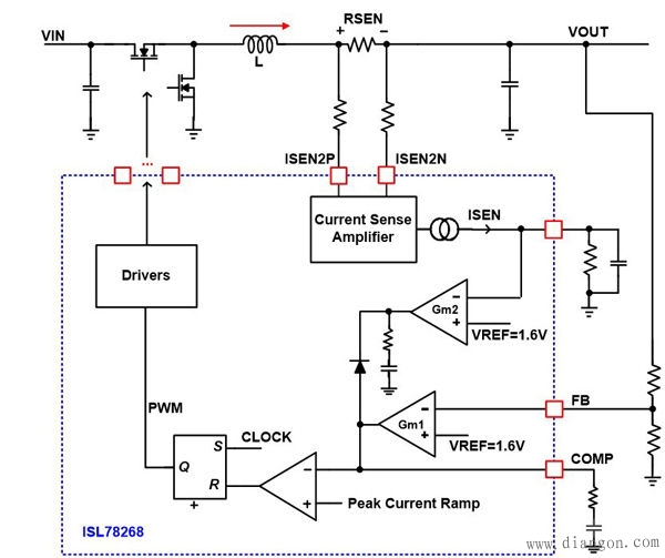 误差放大器Gm2用于CI闭环控制。它比较IMON/DE引脚电压与内部1.6V参考电压,并在COMP引脚产生误差电压。IMON/DE引脚电压是内部产生的,代表平均输出电感电流负载值。因此,COMP电压在Gm2回路激活时(Gm1和Gm2的输出之间的二极管有效地选择哪个回路是激活的)代表预期输出电流与实际输出电流之差。然后COMP与电感电流相比较,以生成PWM信号,来控制输出电压,使之保持恒定。