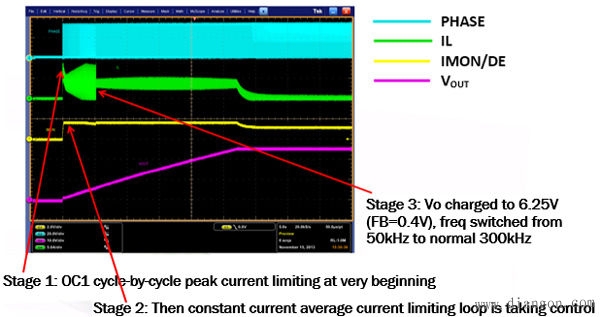 图4显示超级电容充电有多个阶段。开始时,在第1阶段,Vo几乎为0.ISL78268的IMON/DE引脚上的平均电流信号还未达到1.6V(期望充电电流的参考值),所以CI回路还未接通(engage)。在此阶段,电感器的峰值电流被逐周期限制于固定的OC阈值。在VOUT处于低水平(FB<0.4V)的充电阶段开始时,开关频率最大值被限制在50kHz,以预防所提到的因为低VOUT时的峰值电流限制而引起的电感器失控问题。