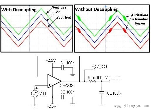 未采用去耦电容的器件无法提供暂态电流,因此放大器的内部节点会下垂(通常称为干扰)。无去耦电容的器件其内部电源干扰会导致器件工作不连续,原因是内部节点未获得正确的偏置。