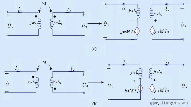 耦合电感两线圈的互感电压各被另一线圈的电流所控制。故根据耦合电感元件的伏安关系,两种基本的耦合电感模型,就可分别等效为图(a),(b)所示的含CCVS电路。