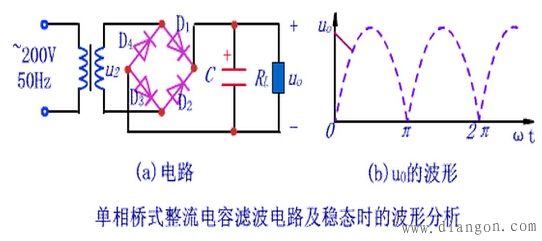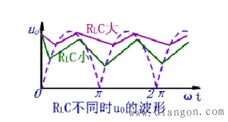 电容充电时间常数为rDC,因为二极管的rD很小,所以充电时间常数小,充电速度快;RLC为放电时间常数,因为RL较大,放电时间常数远大于充电时间常数,因此,滤波效果取决于放电时间常数。电容C愈大,负载电阻RL愈大,滤波后输出电压愈平滑,并且其平均值愈大,如图所示。