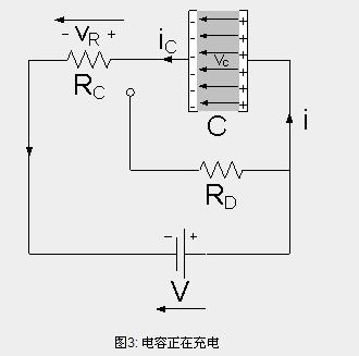 若电容与直流电源相接,见图3,电路中有电流流通。两块板会分别获得数量相等的相反电荷,此时电容正在充电,其两端的电位差vc逐渐增大。一旦电容两端电压vc增大至与电源电压V相等时,vc = V,电容充电完毕,电路中再没有电流流动,而电容的充电过程完成。