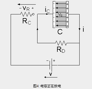 当切断电容和电源的连接后,电容通过电阻RD进行放电,两块板之间的电压将会逐渐下降为零,vc = 0,见图4。