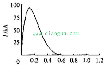 式2中,I0为电流最大值;T为电流脉冲底宽。放电电流曲线见下图3。t<t0负载电流呈正弦变化;t≥t0负载电流呈指数变化。
