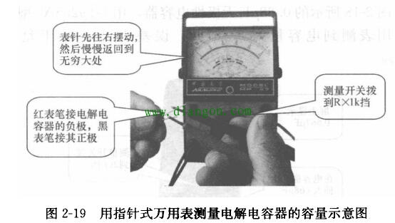 检测电解电容器的质量时,将万用表拨至RXlk挡,红表笔接电解电容器的负极,黑表笔接其正极,若电容器正常,表针将向右偏转,即向的方向摆动,表示电容器充电,然后表针又向左偏转,即无穷大方向回落,并稳定下来,这时表针指示数值为电容器的正向漏电电阻。电解电容器的正向漏电电阻越大,相应的漏电流则越小,一般电容器的正向漏电电阻约为几十千欧或几百千欧以上,如图2-19所示。如果电容器容量大于10uF,为防止表针被打弯,在测量前应将电容器的两端引线短路一下,使电容器的充电电荷释放掉。