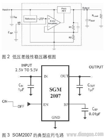 目前大多IC设计产商生产的低压差线性稳压器(LDO)典型封装都是SOT23-5和SOT23-3,如圣邦微电子的SGM2007,SGM2013。图3为SGM2007的典型应用电路图。