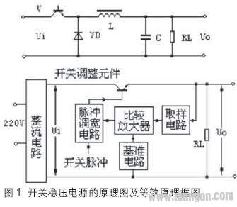 图1画出了开关稳压电源的原理图及等效原理框图,它是由全波整流器,开关管Vi,激励信号,续流二极管VD,储能电感和滤波电容C组成。实际上,开关稳压电源的核心部分是一个直流变压器。这里我们对直流变换器和逆变器作如下解释。逆变器,它是把直流转变为交流的装置。逆变器通常被广泛地应用在采用电平或电池组成的备用电源中。直流变换器,它是把直流转换成交流,然后又把交流转换成直流的装置。这种装置被广泛地应用在开关稳压电源中。采用直流变换器可以把一种直流供电电压变换成极性、数值各不同的多种直流供电电压。