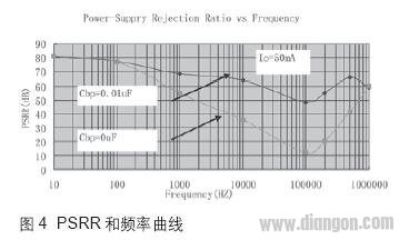电源抑制比(PSRR,Powersupplyripplerejectionratio)是反应LDO输出对输入纹波抑制能力的一个交流参数,一般输出和输入的频率是一样的,PSRR的值越大说明LDO的纹波能力越强,也就是说输入对输出的影响很小。尽管LDO的电源抑制比很强,但都是在一定频率内的抑制很强,一般的在50KHz到200kHz的电源抑制比还是很差的如图4为SGM2007的PSRR和频率曲线,而这段频率正是大多数开关电源的工作频率,如果LDO的负载和输入输出电容匹配不好,很容易引起LDO振荡。而造成整个LDO供电系统的不稳定。
