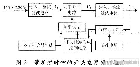 对于一个周期信号尤其是方波来说,其能量主要分布在基频信号和谐波分量中,谐波能量随频率的增加呈级数降低。由于n次谐波的带宽是基频带宽的n倍,通过扩频技术将谐波能量分布在一个更宽的频率范围上。由于基频和各次谐波能量减少,其发射强度也应该相应降低。要在开关电源中采用扩频时钟信号,需要对该电源开关脉冲控制电路输出的脉冲信号进行调制,形成扩频时钟(如图3所示)。与传统的方法相比,采用扩频技术优化开关电源EMI既高效又可靠,无需增加体积庞大的滤波器件和繁琐的屏蔽处理,也不会对电源的效率带来任何负面影响。