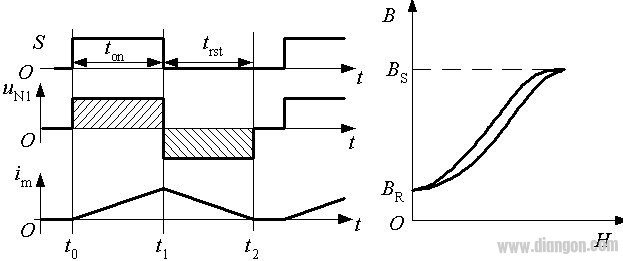 c> 变压器的磁心复位:开关S开通后,变压器的激磁电流由零开始,随着时间的增加而线性的增长,直到S关断.为防止变压器的激磁电感饱和,必须设法使激磁电流在S关断后到下一次再开通的一段时间内降回零,这一过程称为变压器的磁心复位.