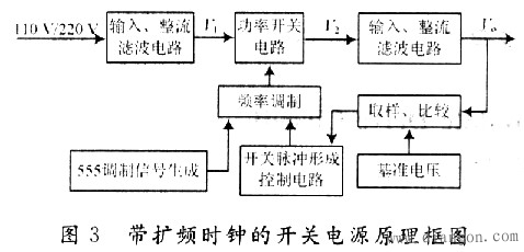 对于一个周期信号尤其是方波来说,其能量主要分布在基频信号和谐波分量中,谐波能量随频率的增加呈级数降低。由于n次谐波的带宽是基频带宽的n倍,通过扩频技术将谐波能量分布在一个更宽的频率范围上。由于基频和各次谐波能量减少,其发射强度也应该相应降低。要在开关电源中采用扩频时钟信号,需要对该电源开关脉冲控制电路输出的脉冲信号进行调制,形成扩频时钟(如图3所示)。与传统的方法相比,采用扩频技术优化开关电源EMI既高效又可靠,无需增加体积庞大的滤波器件和繁琐的屏蔽处理,也不会对电源的效率带来任何负面影响。