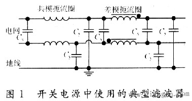 脉冲电流回路通过电磁感应其他电路与大地或机壳组成的回路产生的干扰信号为共模信号;开关电源电路中开关管的集电极与其他电路之间产生很强的电场,电路会产生位移电流,而这个位移电流也属于共模干扰信号。图1中共模滤波器就是用来抑制共模干扰,使之受到衰减。