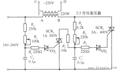 如下图所示,当电网电压小于220V时,双向可控硅SCR2控制极上的电压也随电网电压减小而降低,致使VD2导通角小,C1端电压上升,从而使双向可控硅SCRl控制极电压升高,使输出电压上升。反之,输出电压下降,达到稳压。