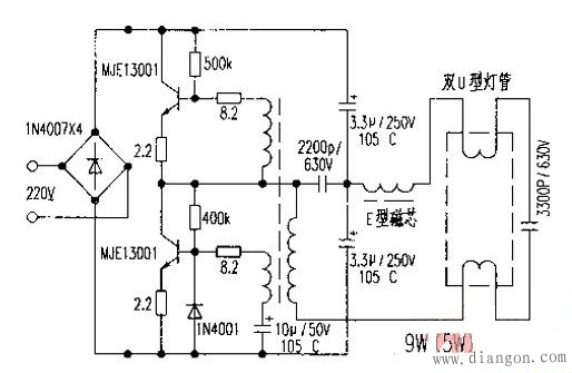 如下图所示,本文介绍的是一款小功率的电子镇流器电路,此电子镇流器的功率为9W(5W)。