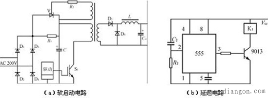 如下图(a)所示,在电源接通瞬间,输入电压经整流桥(D1~D4)和限流电阻R1对电容器C充电,限制浪涌电流。当电容器C充电到约80%额定电压时,逆变器正常工作。经主变压器辅助绕组产生晶闸管的触发信号,使晶闸管导通并短路限流电阻R1,开关电源处于正常运行状态。为了提高延迟时间的准确性及防止继电器动作抖动振荡,延迟电路可采用图(b)所示电路替代RC延迟电路。