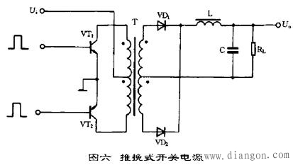 推挽式开关电源的典型电路如图六所示。它属于双端式变换电路,高频变压器的磁芯工作在磁滞回线的两侧。电路使用两个开关管VT1和VT2,两个开关管在外激励方波信号的控制下交替的导通与截止,在变压器T次级统组得到方波电压,经整流滤波变为所需要的直流电压。