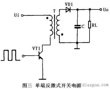 单端反激式开关电源的典型电路如图三所示。电路中所谓的单端是指高频变换器的磁芯仅工作在磁滞回线的一侧。所谓的反激,是指当开关管VT1 导通时,高频变压器T初级绕组的感应电压为上正下负,整流二极管VD1处于截止状态,在初级绕组中储存能量。当开关管VT1截止时,变压器T初级绕组中存储的能量,通过次级绕组及VD1 整流和电容C滤波后向负载输出。