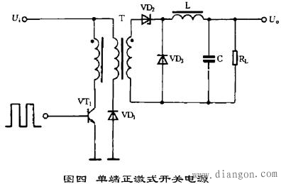 单端正激式开关电源的典型电路如图四所示。这种电路在形式上与单端反激式电路相似,但工作情形不同。当开关管VT1导通时,VD2也