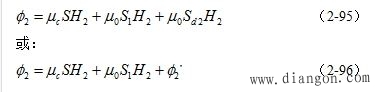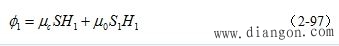 (2-95)、(2-96)式中,μ0sd2H2=φ2就是变压器次级线圈N2对初级线圈N1的漏磁通;因为,这一部分磁通没有穿过变压器初级线圈N1。漏磁通可以等效成是由一个电感单独产生,这个电感就称为漏感,记为Ls。同理,也可以求得流过变压器初级线圈N1中的电流I1产生的磁通量为: