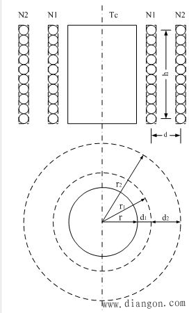 在图2-30中,N1、N2分别为变压器的初、次级线圈,Tc是变压器铁芯。r是变压器铁芯的半径,r1、r2分别是变压器初、次级线圈的半径;d1为初级线圈到铁芯的距离,d2为初、次级线圈之间的距离。为了分析计算简单,这里假设变压器初、次级线圈的匝数以及线径相等,流过线圈的电流全部集中在线径的中心;因此,它们之间的距离全部是两线圈之间的中心距离,如虚线所示。