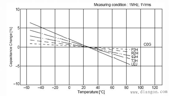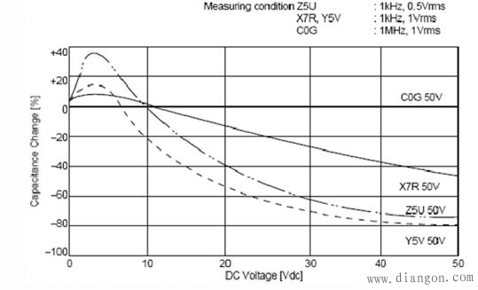 2)瓷片电容存放电靠的是物理反应,因而具有很高的响应速度,可以应用到上G的场合。不过,瓷片电容因为介质不同,也呈现很大的差异。性能最好的是C0G材质的电容,温度系数小,不过材质介电常数小,所以容值不可能做太大。而性能最差的是Z5U/Y5V材质,这种材质介电常数大,所以容值能做到几十微法。但是这种材质受温度影响和直流偏压(直流电压会致使材质极化,使电容量减小)影响很严重。下面我们看一下C0G、X5R、Y5V三种材质电容受环境温度和直流工作电压的影响。