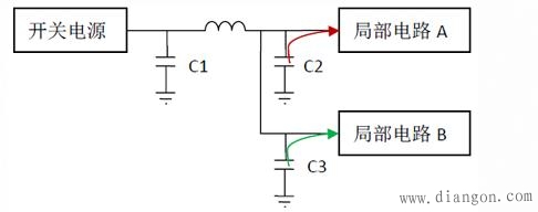 图中开关电源为A和B供电。电流经C1 后再经过一段PCB 走线(暂等效为一个电感,实际用电磁波理论分析这种等效是有误的,但为方便理解,仍采用这种等效方式。)分开两路分别供给A 和B。开关电源出来的纹波比较大,于是我们使用C1对电源进行滤波,为A和B提供稳定的电压。C1需要尽可能的靠近电源放置。C2和C3均为旁路电容,起退耦作用。当A在某一瞬间需要一个很大的电流时,如果没有C2 和C3,那么会因为线路电感的原因A端的电压会变低,而B端电压同样受A端电压影响而降低,于是局部电路A的电流变化引起了局部电路B的电源电压,从而对B电路的信号产生影响。同样,B的电流变化也会对A 形成干扰。这就是“共路耦合干扰”。