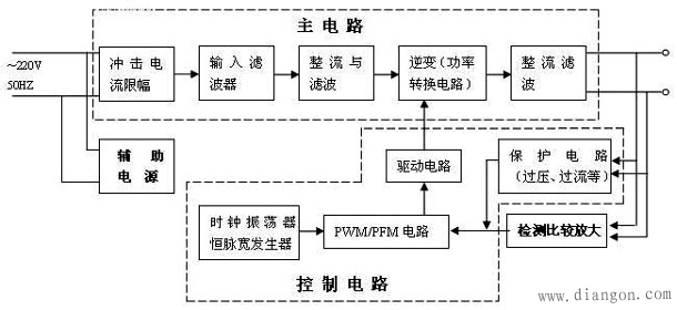 电源是各种电子设备必不可缺的组成部分,其性能优劣直接关系到电子设备的技术指标及能否安全可靠地工作。由于开关电源内部关键元器件工作在高频开关状态,功耗小,转化率高,且体积和重量只有线性电源的20%~30%,故目前它已成为稳压电源的主流产品。 一、开关电源的组成 开关电源大至由主电路、控制电路、检测电路、辅助电源四大部份组成(见图) 1、主电路 冲击电流限幅:限制接通电源瞬间输入侧的冲击电流。 输入滤波器:其作用是过滤电网存在的杂波及阻碍本机产生的杂波反馈回电网。 整流与滤波:将电网交流电源直接整流为较平滑的直流电。 逆变:将整流后的直流电变为高频交流电,这是高频开关电源的核心部分。 输出整流与滤波:根据负载需要,提供稳定可靠的直流电源。 2、控制电路 一方面从输出端取样,与设定值进行比较,然后去控制逆变器,改变其脉宽或脉频,使输出稳定,另一方面,根据测试电路提供的数据,经保护电路鉴别,提供控制电路对电源进行各种保护措施。 3、检测电路 提供保护电路中正在运行中各种参数和各种仪表数据。 4、辅助电源 实现电源的软件(远程)启动,为保护电路和控制电路(PWM等芯片)工作供电。 二.开关电源的工作原理 开关电源就是采用功率半导体器件作为开关元件,通过周期性通断开关,控制开关元件的占空比来调整输出电压。开关元件以一定的时间间隔重复地接通和断开,在开关无件接通时输入电源Vi通过开关S和滤波电路向负载RL提供能量,当开关S断开时,电路中的储能装置(L1、C2、二极管D组成的电路)向负载RL释放在开关接通时所储存的能量,使负载得到连续而稳定的能量。 VO=TON/T*Vi VO为负载两端的电压平均值 TON为开关每次接通的时间 T为开关通断的工作周期 由式可知,改变开关接通时间和工作周期的比例,VO间电压平均值也随之改变,因此,随着负载及输入电源电压的变化自动调整TON和T的比例便使输出电压VO维持不变。改变接通时间TON和工作周期比例亦即改变脉冲的占空比,这种方法称为“时间比率控制”(Time Ration Control,缩写为TRC)。 按TRC控制原理,有三种方式: 1、脉冲宽度调制(Pulse With Modulation,缩写为PWM):开关周期恒定,通过改变脉冲宽度来改变占空比的方式。 2、脉冲频率调制(Pulse Frequency Modulation,缩写为PFM):导通脉冲宽度恒定,通过改变开关工作频率来改变占空比的方式。 3、混合调制:导通脉冲宽度和开关工作频率均不固定,彼此都能改变的方式,它是以上二种方式的混合。 |
